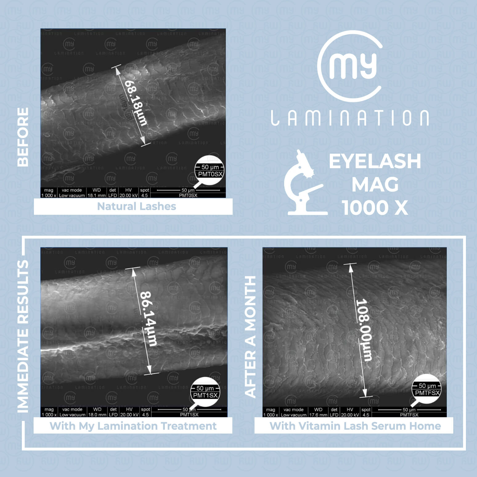 The purpose of the study was to evaluate the volumizing effectiveness of a professional cosmetic treatment on eyelashes by measuring the diameter of the collected eyelashes, expressed in microns, using an ESEM electron microscope.